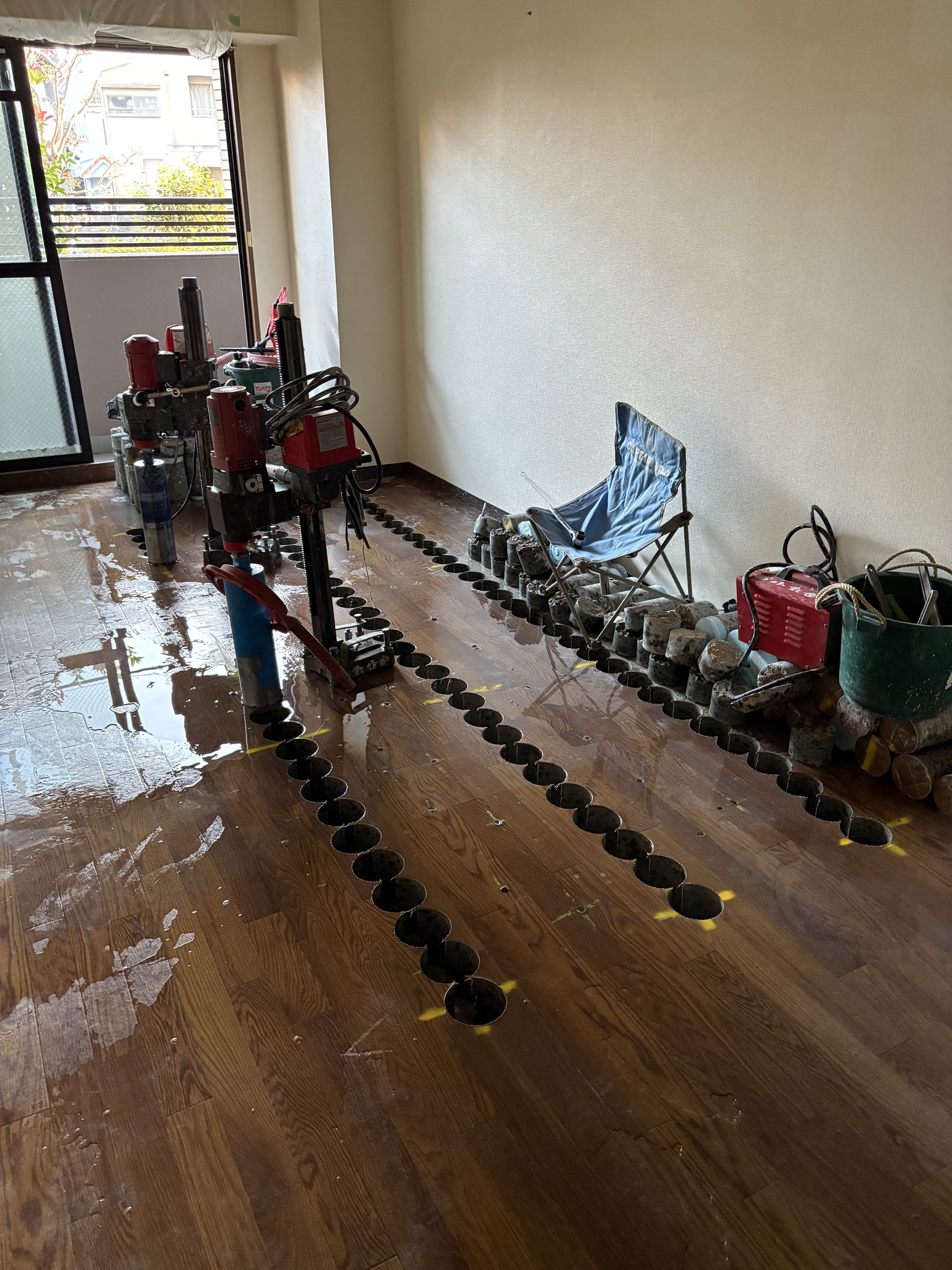 ダイヤモンドコアビットを使用して、壁や土間の躯体に穴を開ける作業です。